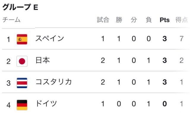 FIFAワールドカップ(W杯)カタール2022のE組は、2試合を終えて1勝1分のスペインが首位につけ、その背後に1勝を挙げた日本とコスタリカが3ポイントで並び、ここまで未勝利のドイツが1ポイントで最下位からの逆転突破を図る。